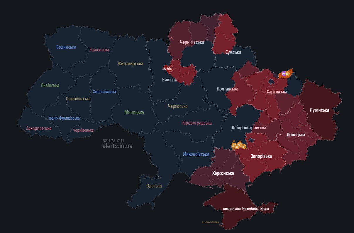 Ввечері 15 листопада у Києві та низці областей оголосили повітряну тривогу. Причина — атака російських дронів.