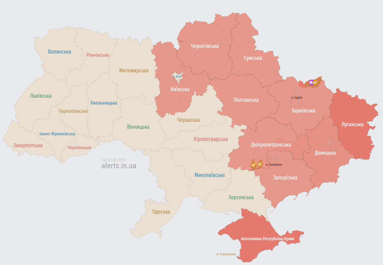 У п'ятницю, 12 грудня, російські окупаційні війська, ймовірно, здійснили пуски крилатих ракет зі стратегічних бомбардувальників Ту-95МС. У низці українських областей оголошено повітряну тривогу.