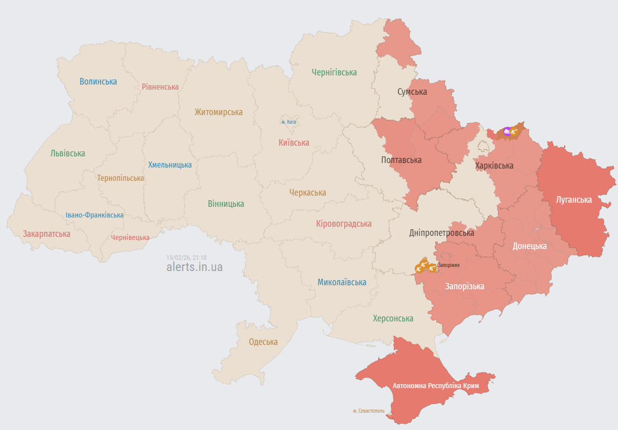 Увечері 15 лютого російські окупанти розпочали чергову атаку ударними безпілотниками, спрямувавши їх на північні, східні та південні регіони України. Станом на зараз загроза ударів із повітря залишається актуальною для Сумської, Харківської, Запорізької та Дніпропетровської областей.
