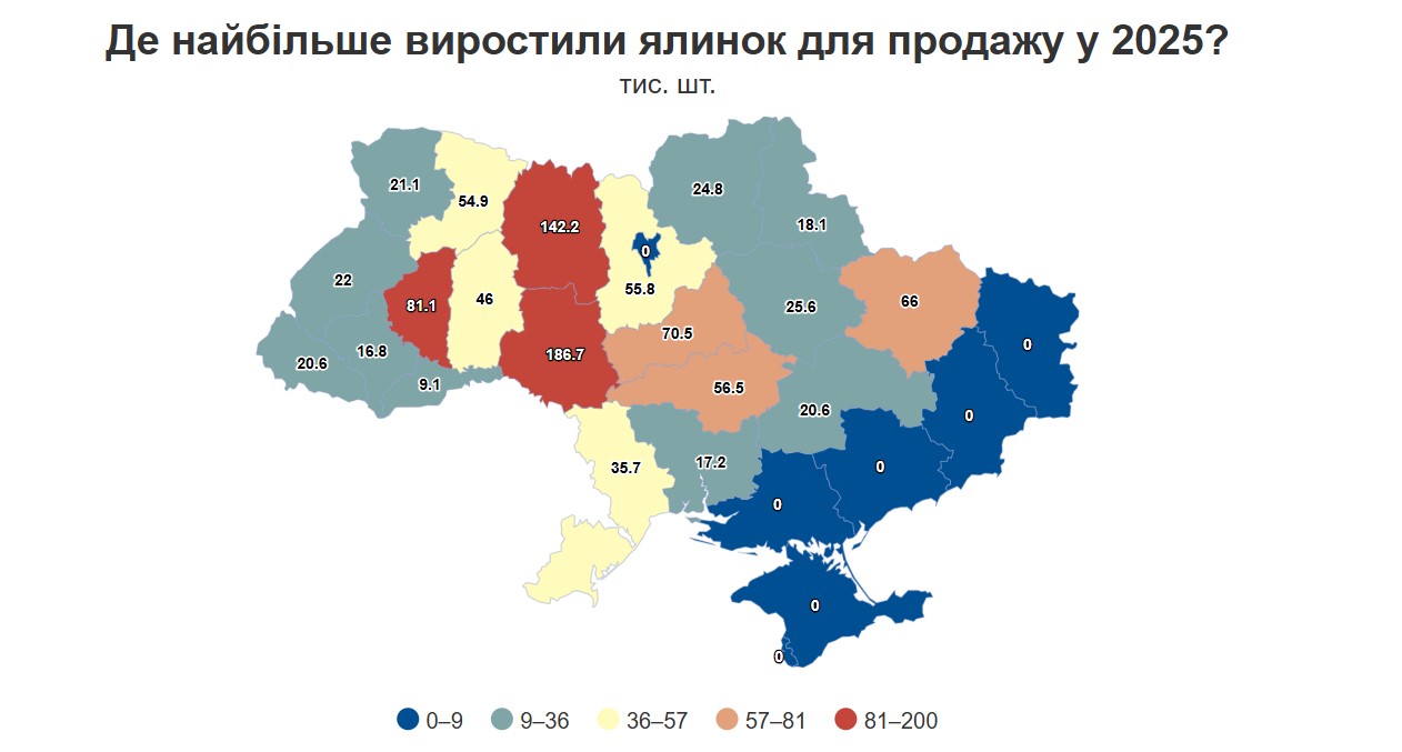 Для порівняння, за весь попередній сезон лісгоспи реалізували 153,7 тисячі дерев, що на 38% менше, ніж у сезоні 2023–2024 років, і майже на чверть менше, ніж у 2022–2023 роках. Найбільші обсяги святкових дерев цього сезону зосереджені у двох регіонах. Лідером за кількістю запланованих до реалізації ялинок є Вінницька область — 187 тисяч дерев. Друге місце посідає Житомирщина з показником 142 тисячі ялинок.