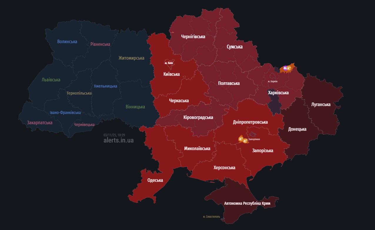 Ввечері 3 листопада у Києві та низці областей оголосили повітряну тривогу. Причина — ракетна небезпека.