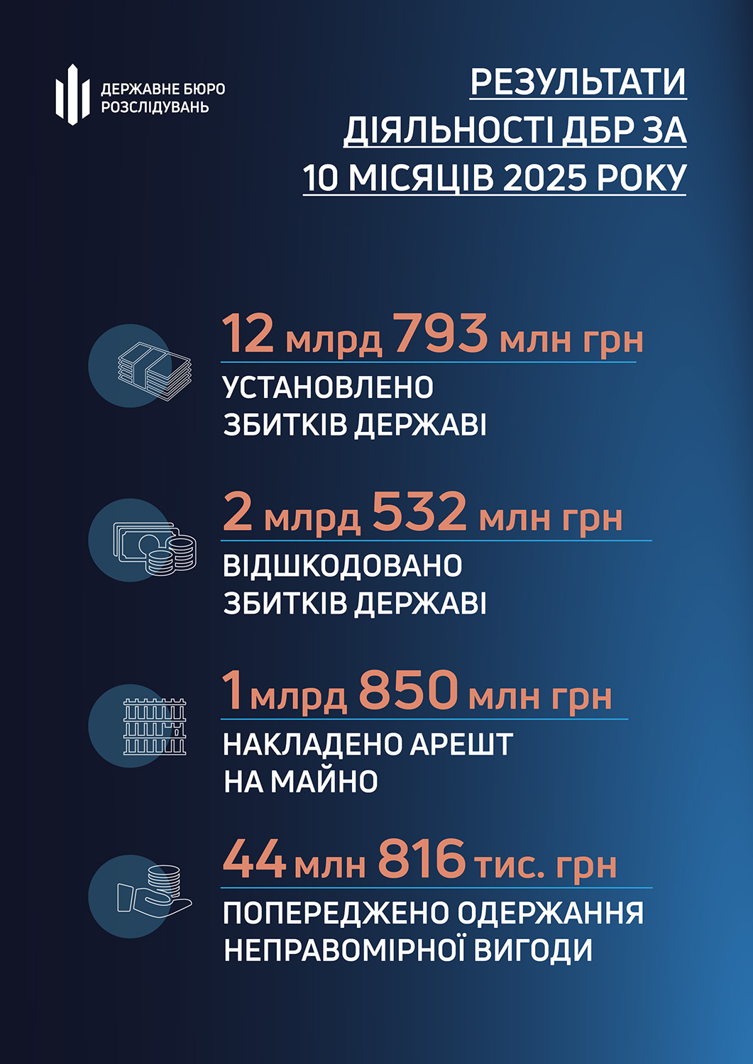 Впродовж цього року співробітники Державного бюро розслідувань задокументували злочини, через які держава зазнала збитків на 12 мільярдів та 793 мільйони гривень.