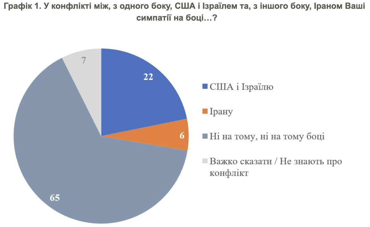За результатами дослідження, 65% респондентів заявили, що не симпатизують жодній зі сторін. Підтримку США та Ізраїлю висловили 22% опитаних, тоді як Ірану — 7%. Ще 7% не змогли визначитися або не були обізнані з конфліктом.