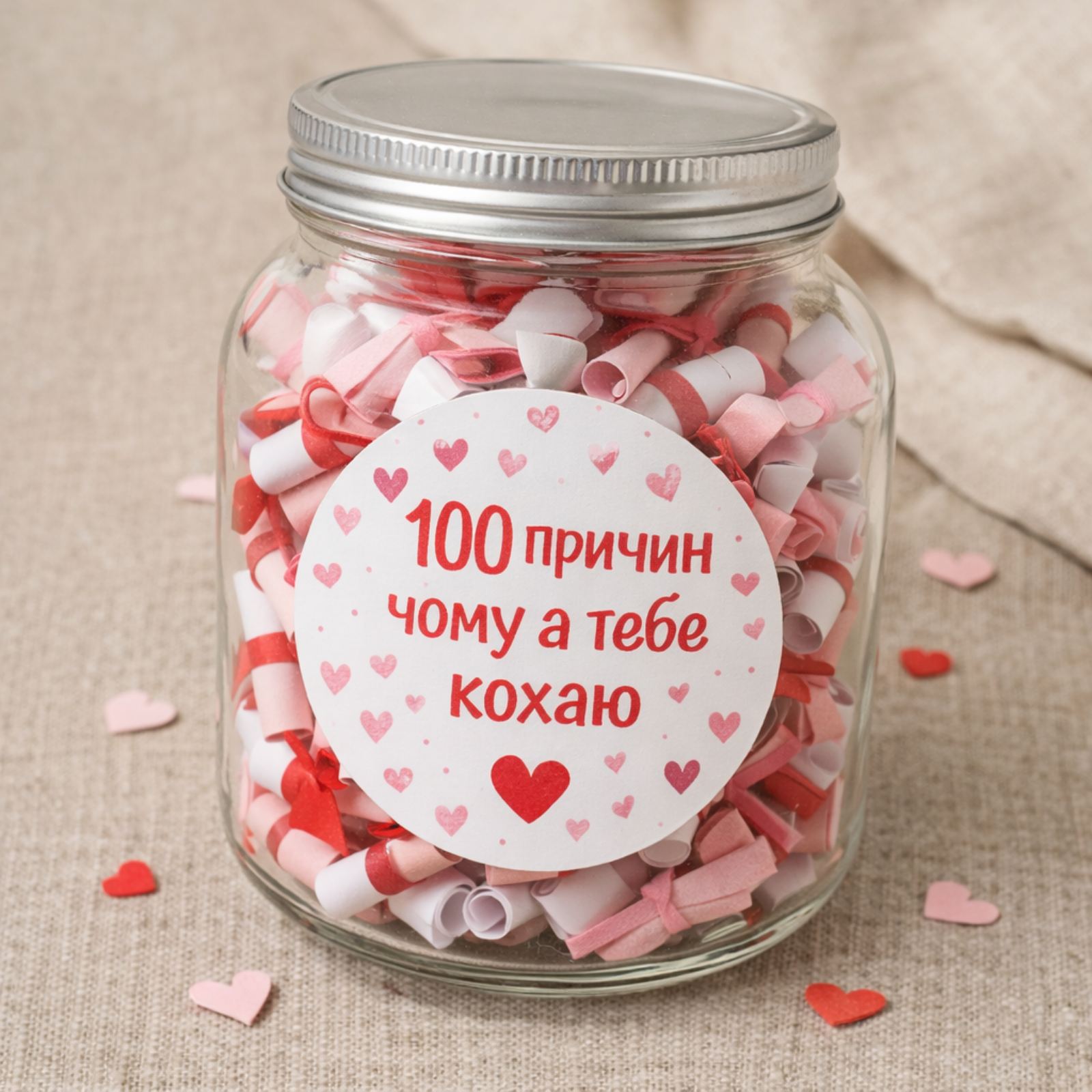 У стильну склянку потрібно помістити 100 маленьких записок, де вказати унікальні причини, чому ви любите свою другу половинку. Такий подарунок додасть романтики у цей святковий день.