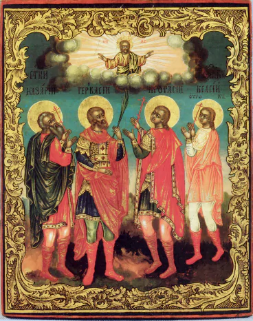 Святі мученики Назарій, Гервасій і Протасій страждали в період правління імператора Нерона. Святий Назарій народився в Римі, і з ранніх років прийняв рішення присвятити своє життя проповіді вчення Христа і допомоги християнам, яких переслідували. У зв'язку з цим, він покинув Рим і попрямував до Мілана. Відвідуючи християн, які перебували в медіоланській в'язниці, Назарій познайомився з двома близнюками, Протасієм і Гервасієм. За свою віру в Христа вони були ув'язнені язичниками. Пізніше усіх їм наказали відрубати голови.