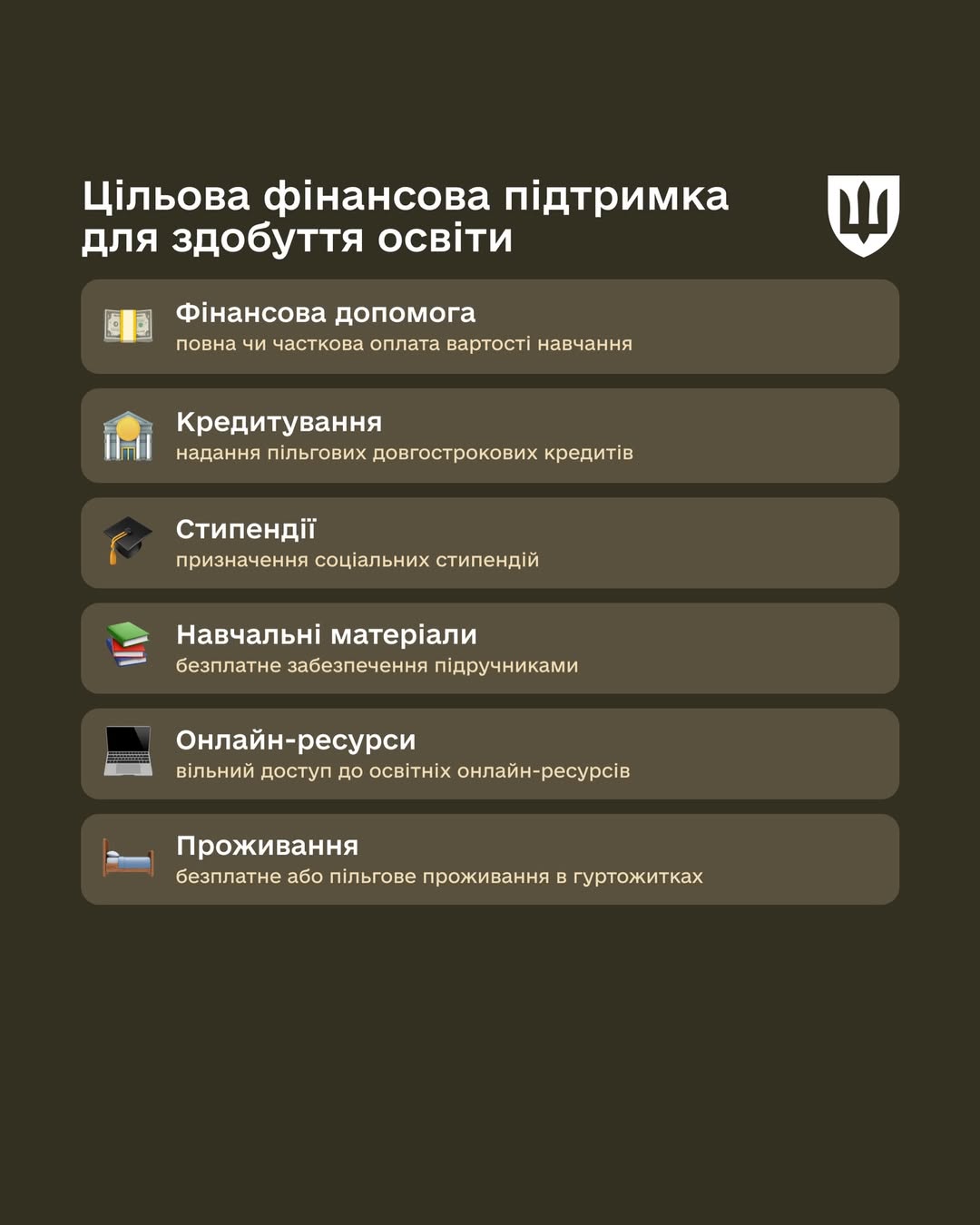 Захисники та їхні родини можуть отримати повну або часткову оплату вартості навчання, пільгові кредити та соціальні стипендії. Крім того, вони забезпечуються підручниками та мають вільний доступ до освітніх онлайн-ресурсів. Для студентів передбачене безплатне або пільгове проживання в гуртожитках.
