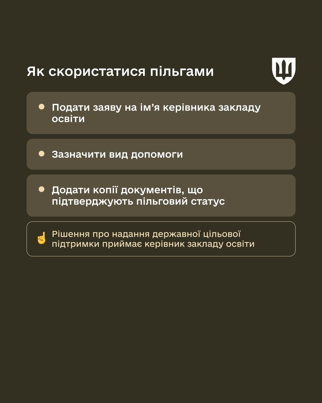Щоб отримати освітню підтримку, потрібно подати заяву на ім’я керівника закладу освіти, вказавши вид допомоги та додавши документи, що підтверджують пільговий статус. Остаточне рішення про надання державної цільової підтримки приймає керівник закладу.