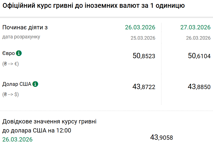 Так, на п'ятницю, 27 березня, Нацбанк встановив офіційний курс на рівні 43,88 гривні за один долар. Офіційний курс у четвер був 43,87. На готівковому ринку долар не змінився — 43,15 гривні.