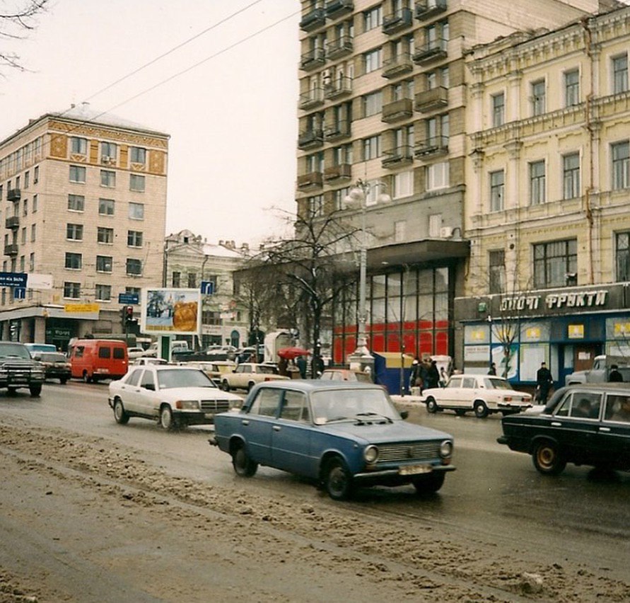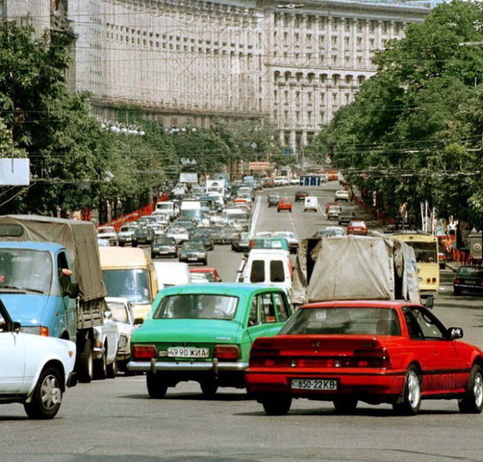 На наступній світлині зображено жвавий рух головною вулицею української столиці. Серед авто є як іномарки, так і машини радянського виробництва.