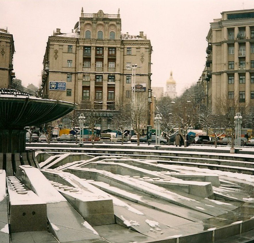 На останньому фото у кадр потрапив фонтан на Майдані Незалежності. Очевидно, що взимку він не працював та був присипаний снігом. На світлині можна розгледіти й перехожих, які прямують у справах.
