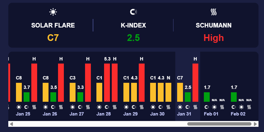 Тож на 1 лютого 2026 року фахівці прогнозують низьку геомагнітну активність з індексом Kp близько 2, що відповідає спокійній або мінімально збуреній магнітосфері.