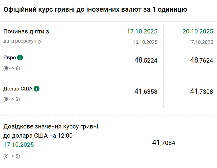 Так, на понеділок, 20 жовтня, Нацбанк встановив офіційний курс на рівні 41,73 гривні за один долар. Офіційний курс у п'ятницю становив 41,63 гривні за один долар. На готівковому ринку долар зріс на 10 копійок — 41,95 гривні.