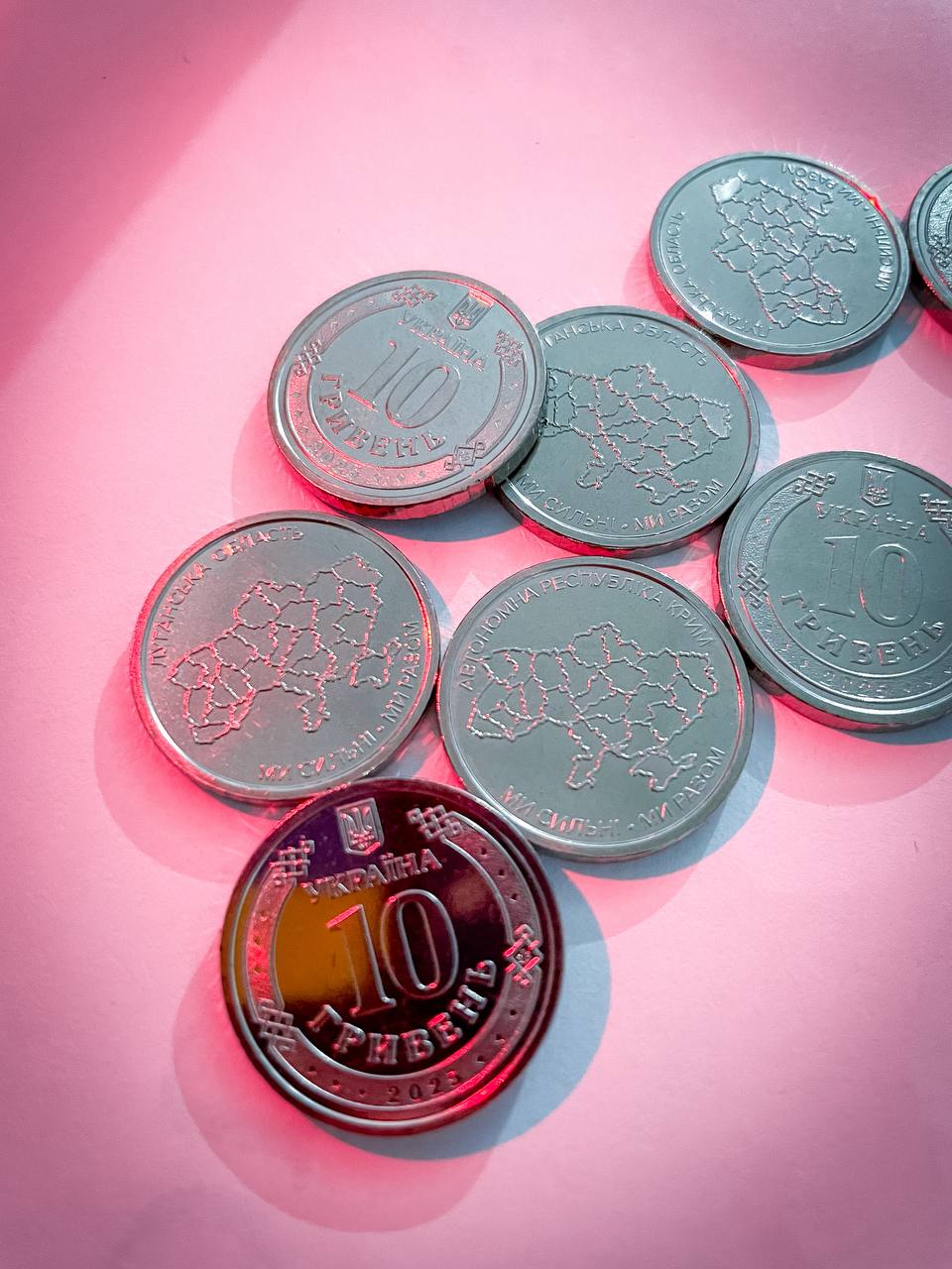 Національний банк України 1 грудня презентував нові обігові монети номіналом 10 гривень. Вони присвячені українській єдності та територіальній цілісності. Як повідомила прем’єр-міністерка України Юлія Свириденко, що в межах серії "Ми сильні. Ми разом" в обіг уведено перші три монети, присвячені регіонам, які першими опинилися в епіцентрі російської агресії: Криму, Донецькій і Луганській областям.