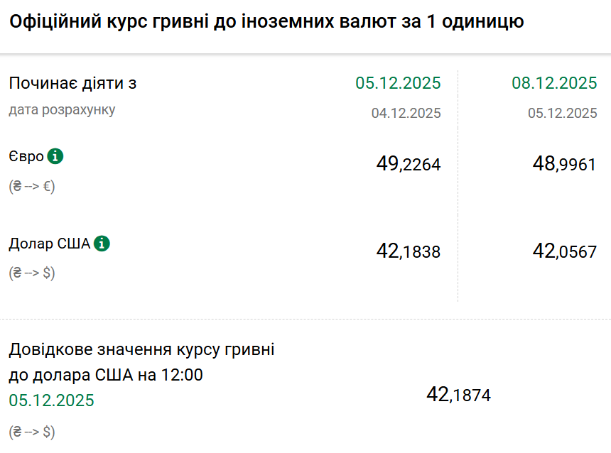 Так, на понеділок Нацбанк встановив офіційний курс на рівні 42,05 гривні за один долар. Офіційний курс у п'ятницю становив 42,22 гривні за один долар. На готівковому ринку долар впаде на 10 копійок — 42,30 гривні.