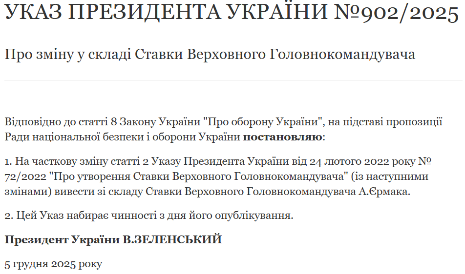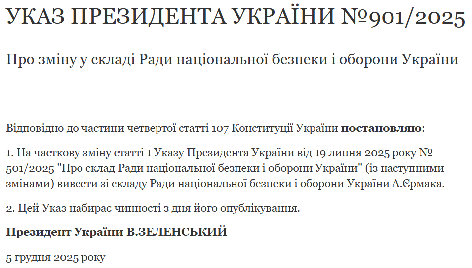 Відповідні укази були оприлюднені на сайті Офісу президента. Згідно з документами, Єрмак виводиться зі складу: