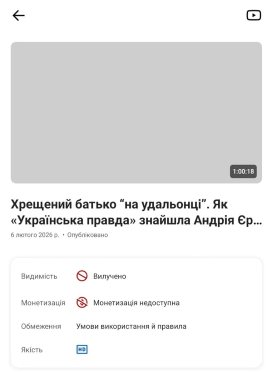 YouTube видалив розслідування журналіста "Української правди" Михайла Ткача "Хрещений батько "на удальонці". Як "Українська правда" знайшла Андрія Єрмака". Його опублікували 6 лютого 2026 року.