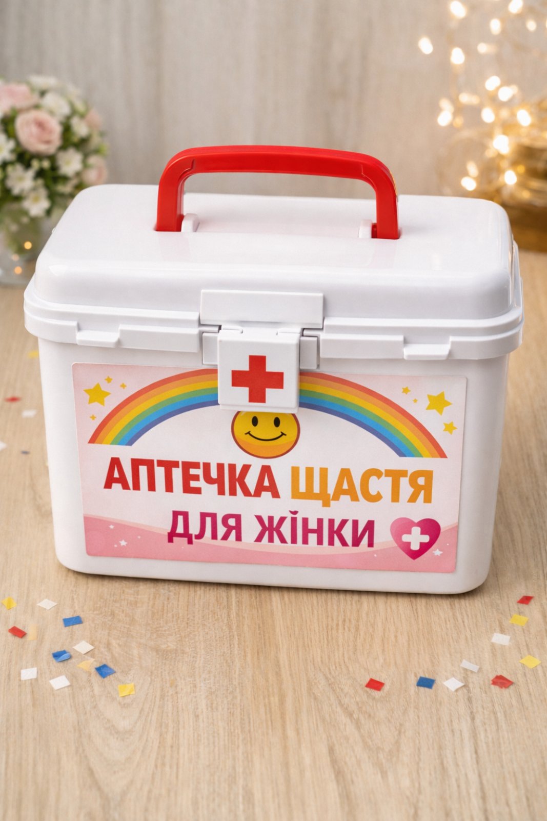 Солодка "аптечка" — це незвичний подарунок, який обов'язково викличе позитивні емоції у вашої обраниці. Її можна зробити вдома, або ж замовити онлайн. Зазвичай аптечку наповнюють цукерками, шоколадками та горішками, де кожні ласощі підписані жартівливими "лікувальними" назвами: "Таблетки від стресу", "Для покращення настрою", "Щоб не боліла голова", "Від нервів", "Проти смутку".