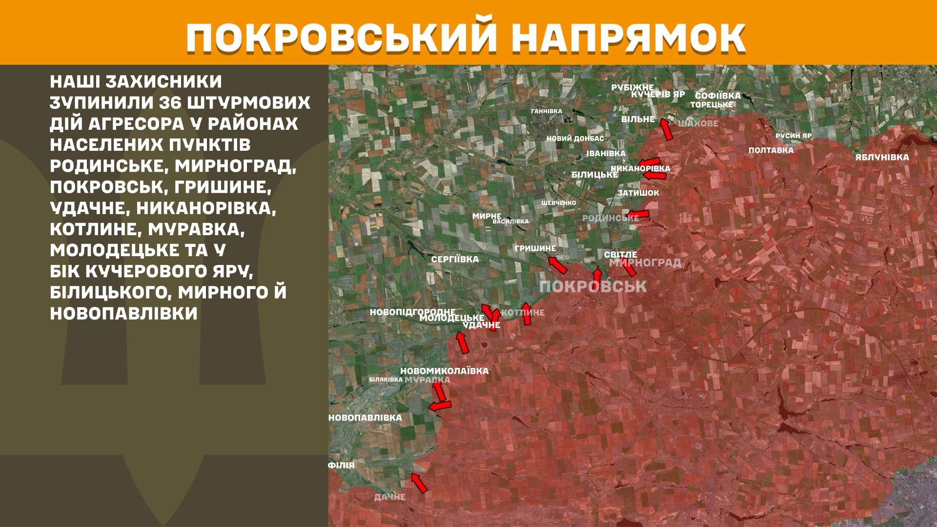На Покровському напрямку наші захисники зупинили 36 штурмових дій агресора у районах населених пунктів Кучерів Яр, Родинське, Мирноград, Покровськ, Гришине, Удачне, Никанорівка, Котлине, Муравка, Молодецьке та у бік Білицького, Мирного й Новопавлівки.