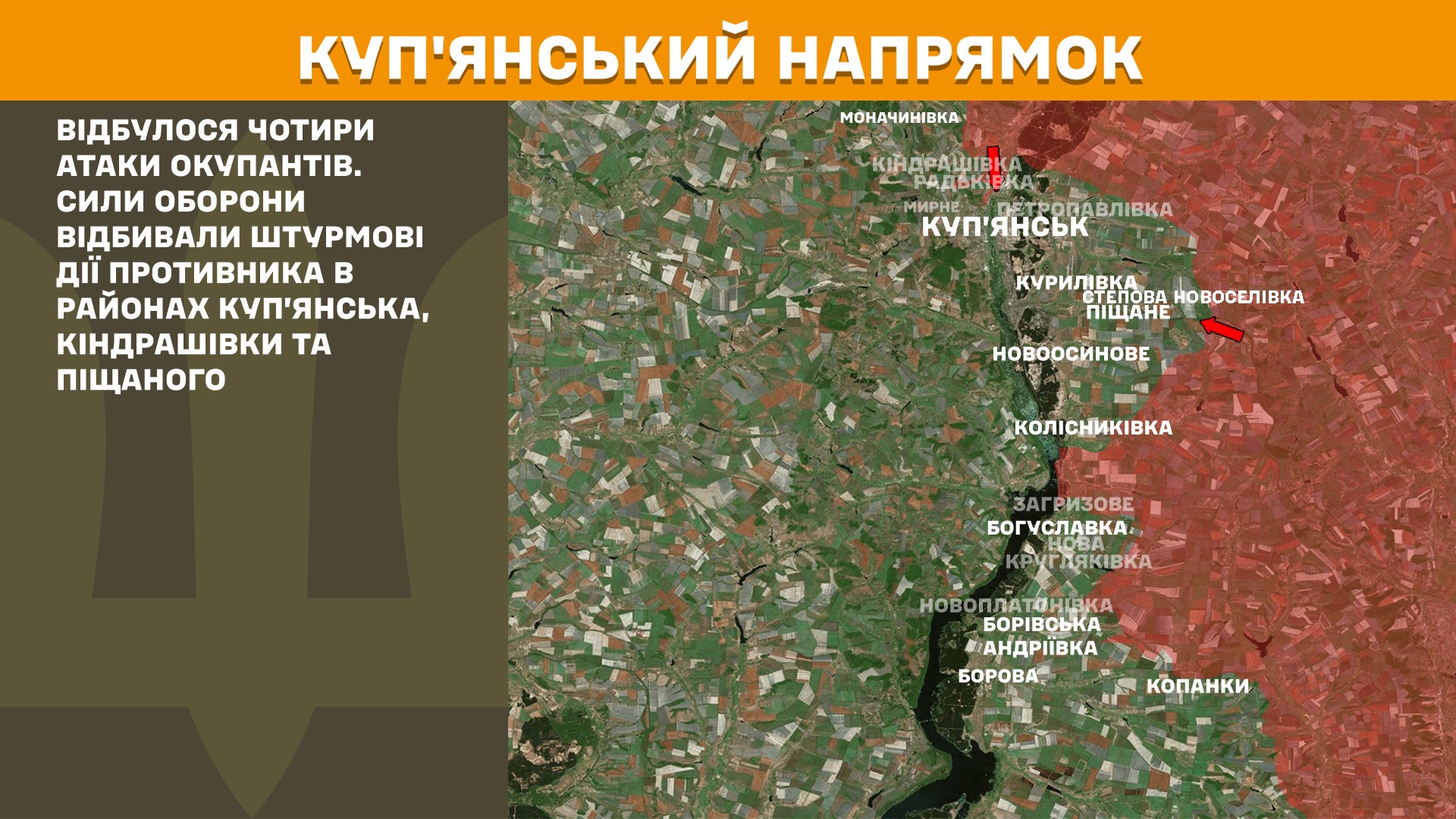 На Куп’янському напрямку відбулося чотири атаки окупантів. Сили оборони відбивали штурмові дії противника в районах Куп’янська, Кіндрашівки та Піщаного.