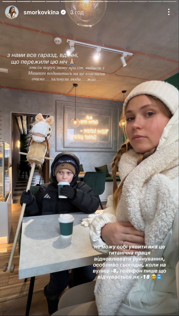 "З нами все гаразд. Вдячні, що пережили цю ніч. Зовсім поруч — знову "приліт". Вийшли з Мишком подивитися на це все власними очима….Загинули люди…Жах…", — написала вона у своєму "сторіз".