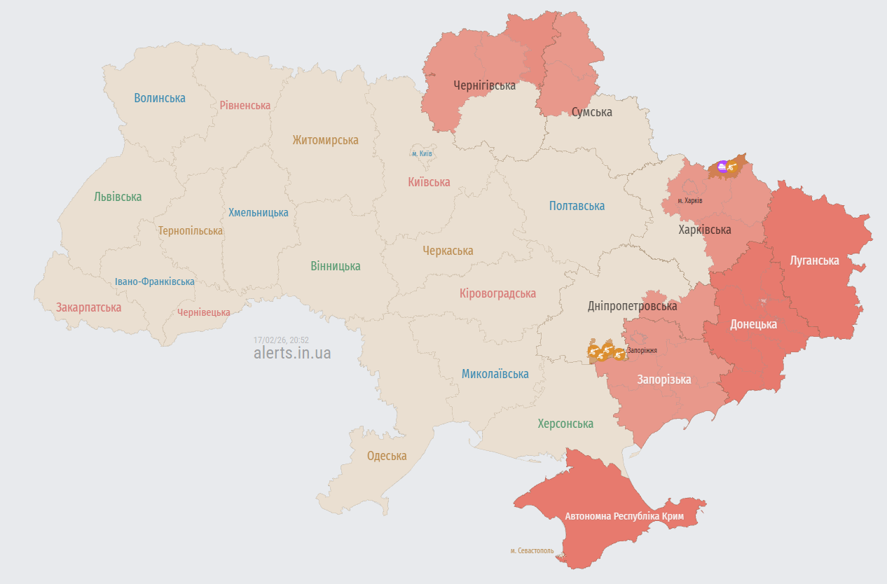 Увечері 17 лютого зафіксовано рух ворожих безпілотників у повітряному просторі кількох областей, причому противник одночасно застосовує як ударні, так і розвідувальні дрони.