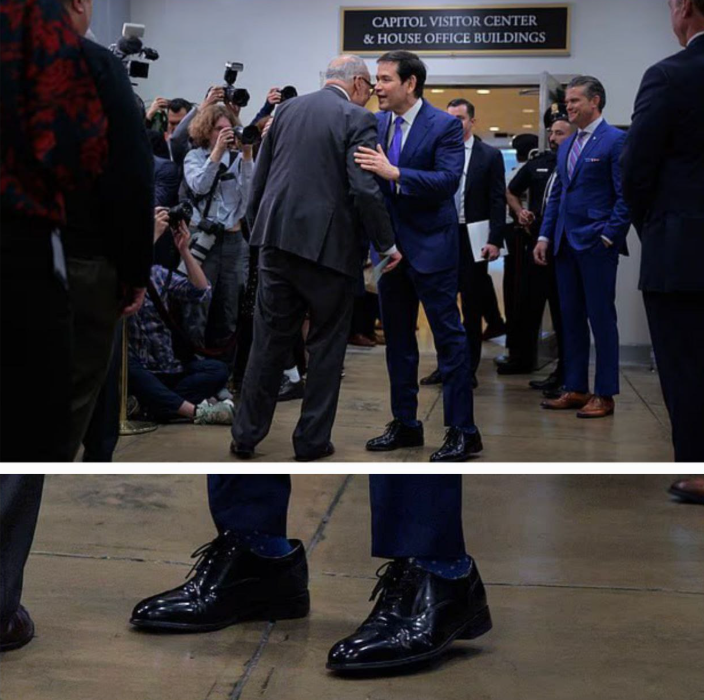 Президент не просто сам носить ці туфлі, а й активно залучає до цього свій "ближній круг". За інформацією інсайдерів, Трамп почав масово дарувати взуття чиказького бренду своїм найближчим помічникам. Серед тих, хто отримав такий презент (і часто змушений його носити), опинилися: Джей Ді Венс, Марко Рубіо та Скотт Бессент.