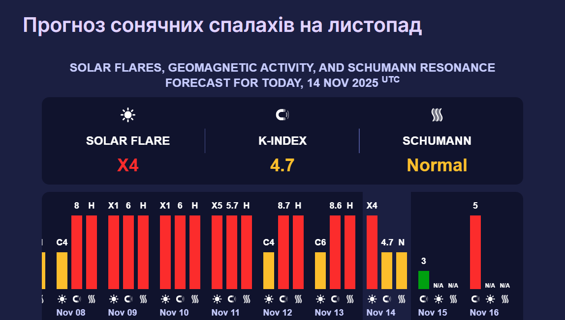 Нагадаємо, згідно з даними Центру прогнозування космічної погоди NOAA, у листопаді магнітні бурі будуть різної інтенсивності.