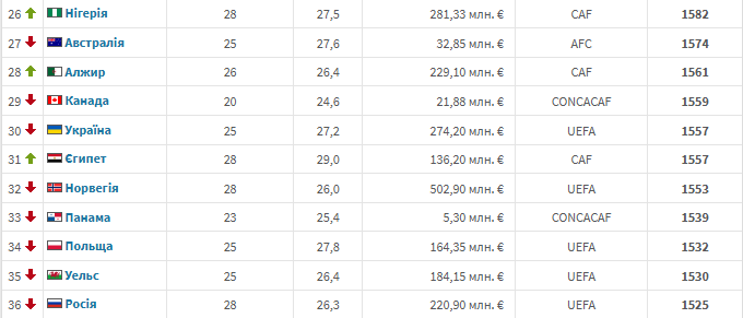 В оновленому рейтингу від Міжнародної федерації футбольних асоціацій збірна України втратила дві позиції та опустилася з 28-го на 30-те місце. В активі підопічних Сергія Реброва 1557,47 бала.