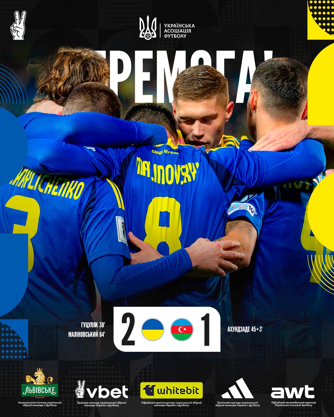 Футболісти збірної України в номінально домашньому матчі відбору на чемпіонат світу 2026 року в польському Кракові здолали команду Азербайджану з мінімальним рахунком 2:1. "Синьо-жовті" закріпилися на другому місці групи.