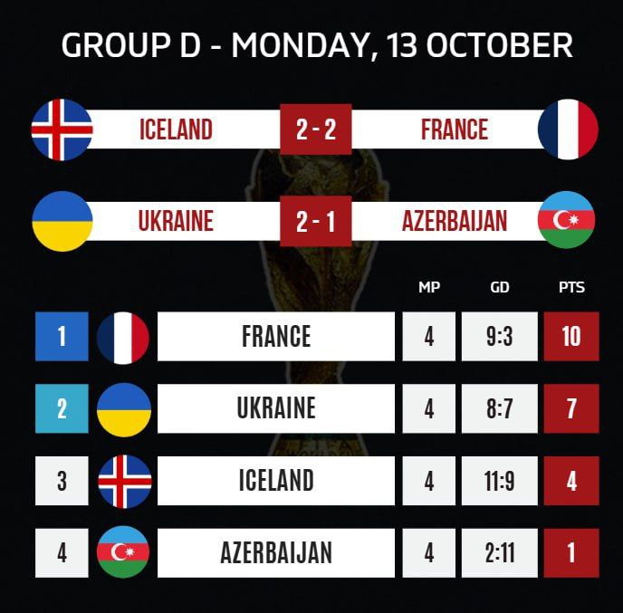 Завдяки перемозі над Азербайджаном збірна України скоротила відставання від лідера групи Франції та збільшила перевагу над Ісландією. В паралельному матчі Франція зіграла внічию з Ісландією (2:2).
