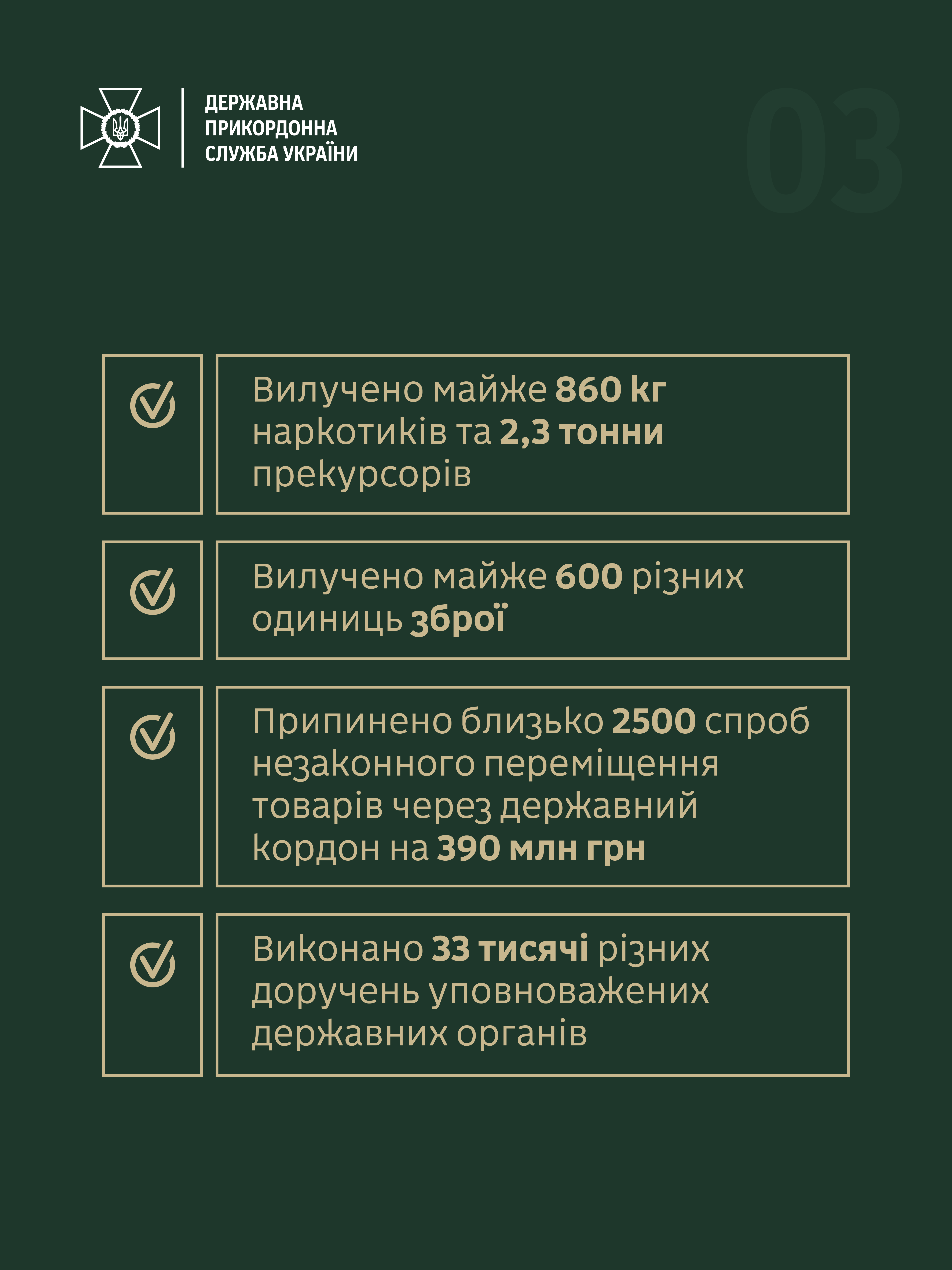 За словами речника Державної прикордонної служби Андрія Демченка, за вісім місяців прикордонники вилучили майже 860 кілограмів наркотиків та майже 2,3 тонни прекурсорів. Було припинено діяльність дев'яти груп у складі 39 осіб, а суди винесли вже цього року 91 обвинувальний вирок.
