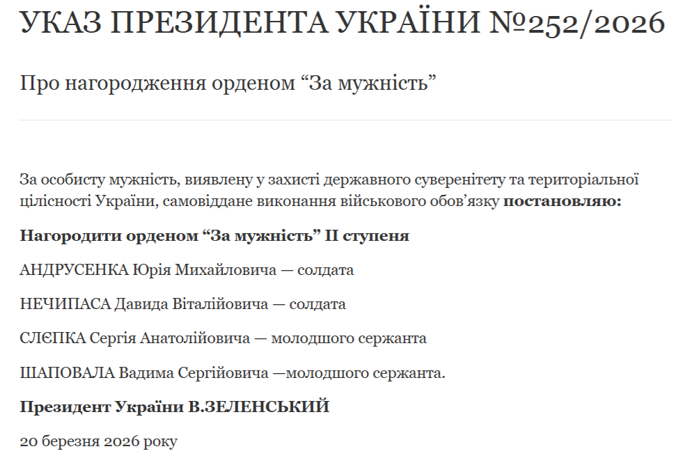 "За особисту мужність, виявлену у захисті державного суверенітету та територіальної цілісності України, самовіддане виконання військового обов’язку", — йдеться на сайті Офісу президента України.