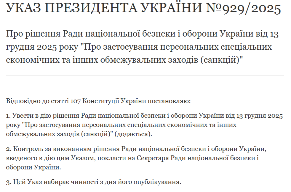 Відповідний указ №929/2025 за підписом голови держави опубліковано на сайті Офісу президента.