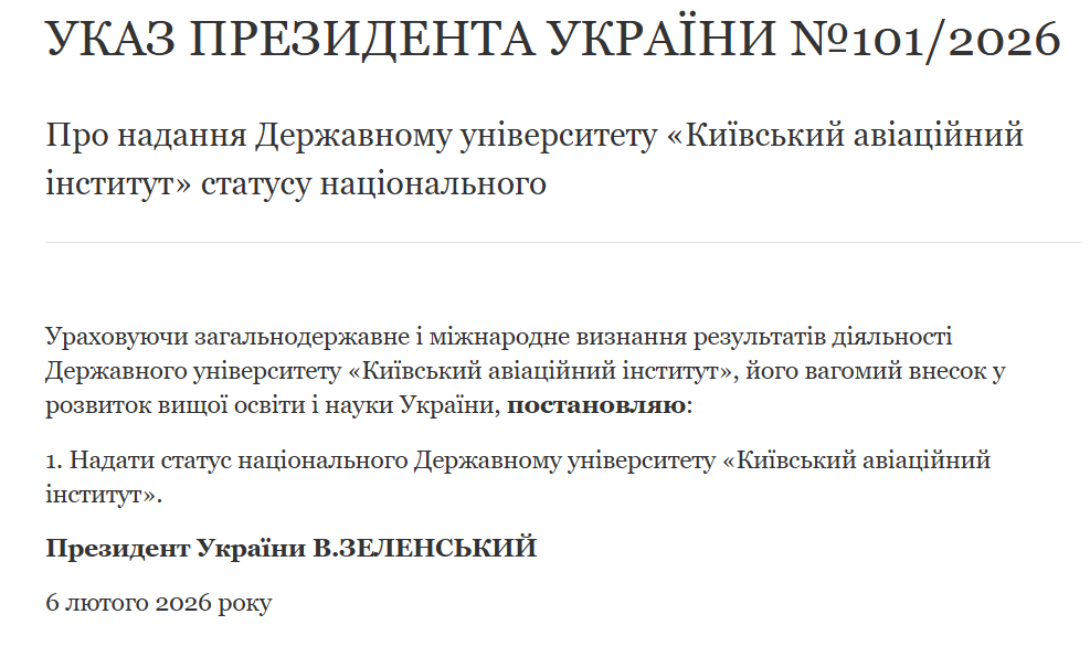 У п'ятницю, 6 лютого, президент Володимир Зеленський присвоїв Державному університету "Київський авіаційний інститут" статус національного.