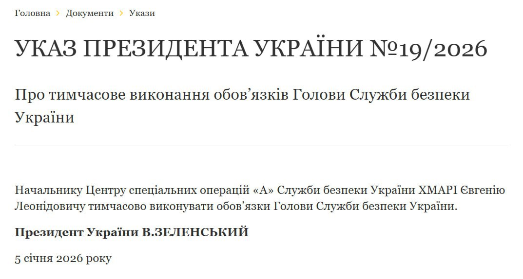"Начальнику Центру спеціальних операцій "А" Служби безпеки України ХМАРІ Євгенію Леонідовичу тимчасово виконувати обов’язки голови Служби безпеки України", — йдеться у тексті указу.