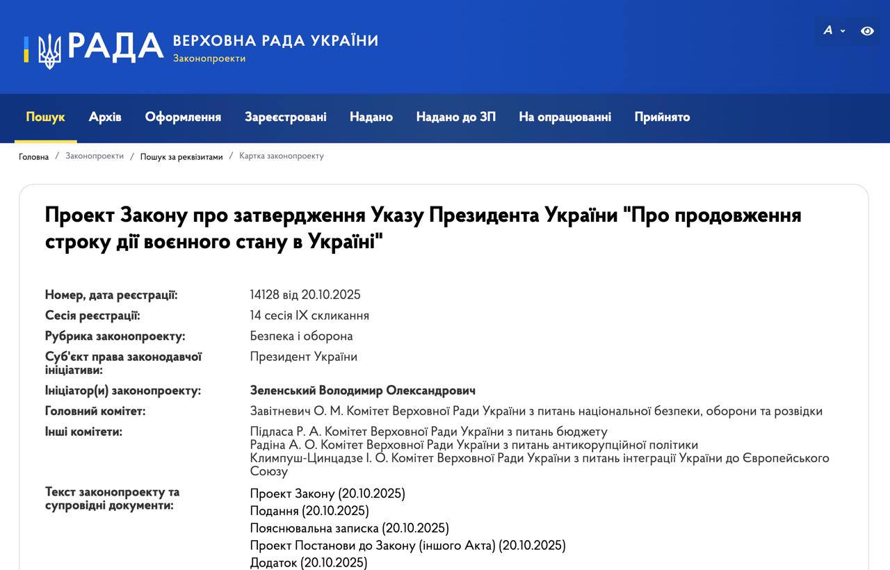 У понеділок, 20 жовтня, Володимир Зеленський вніс до Верховної Ради два законопроекти: про продовження дії воєнного стану та загальну мобілізацію на ще 90 днів — з 5 листопада.