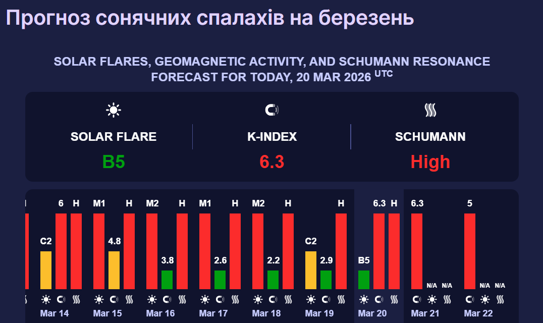 Потужна магнітна буря, яка триває вже майже тиждень, ще не планує відступати. На вихідних, 21 та 22 березня, очікується несприятлива космічна погода.