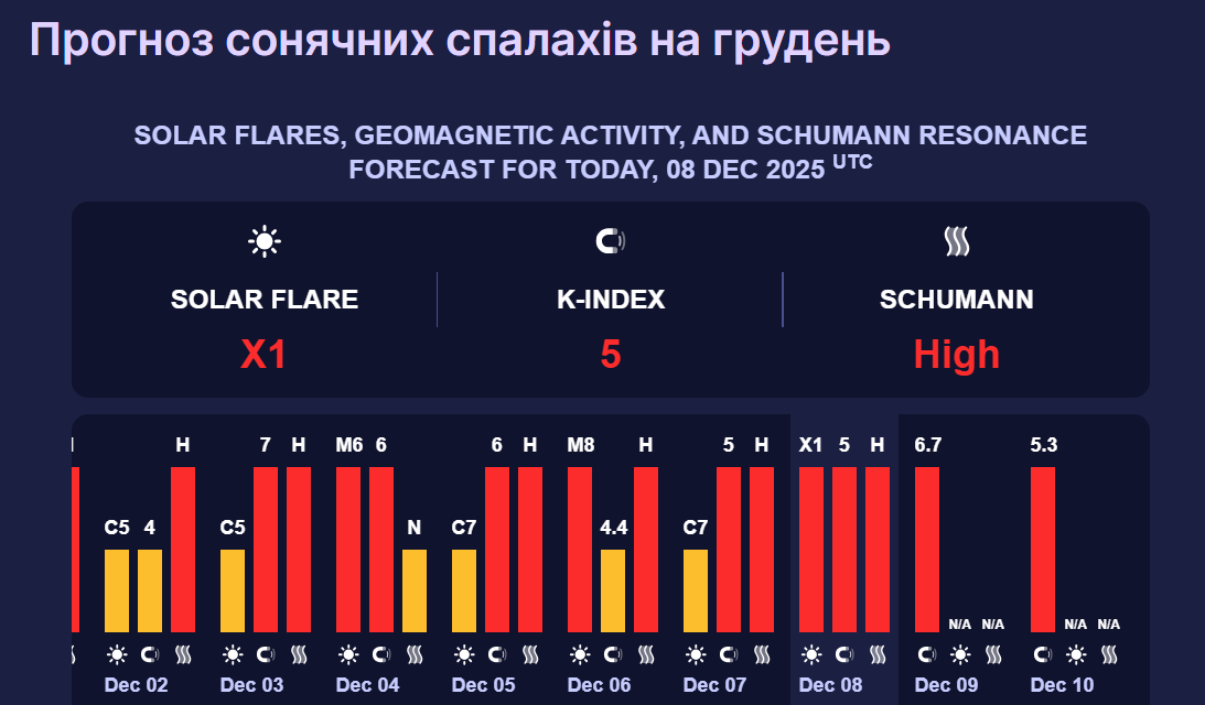 У середу, 10 грудня, прогнозується сонячна активність із К-індексом 5,3 бала, що також відповідає червоному рівню небезпеки.