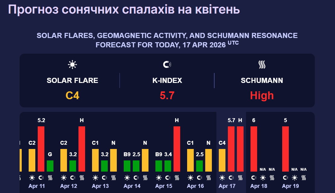 А вже у неділю, 19 квітня, сонячна активність спаде до п'яти балів. Такий К-індекс також відповідає магнітній бурі високої потужності.