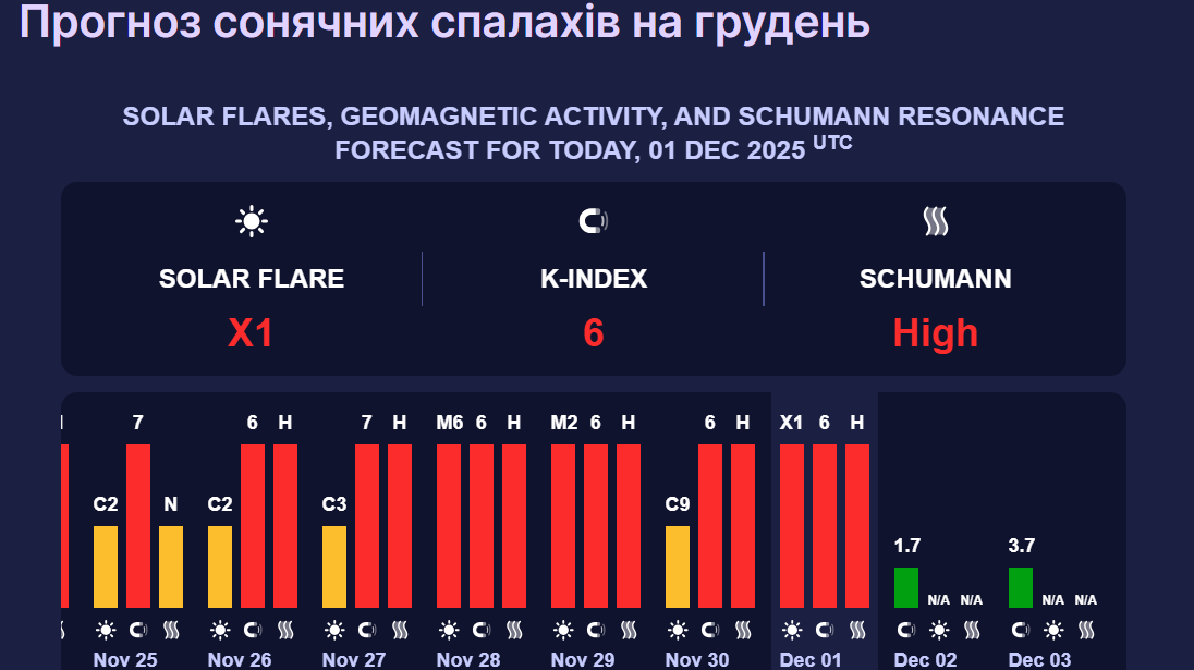 У середу, 3 грудня, геомагнітні коливання, за попереднім прогнозом, зростуть до 3,7 бала. Така буря також також вважається низькою і не впливає на самопочуття.