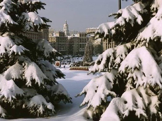 На ще одній світлині можна розгледіти вічнозелені ялинки, які щільно вкрив сніг. Крізь їхні гілки видно й Майдан Незалежності, який у період із 1977 до 1991 року мав назву "Площа Жовтневої революції".