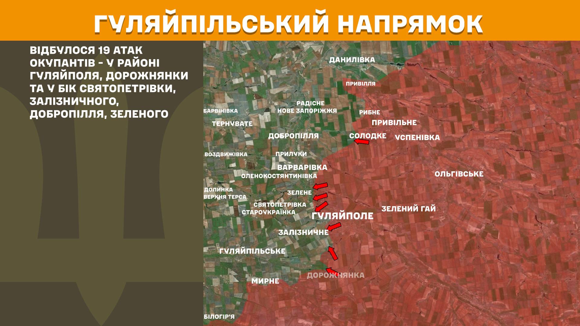 На Гуляйпільському напрямку відбулося 19 атак окупантів — у районі Гуляйполя, Дорожнянки та у бік Святопетрівки, Залізничного, Добропілля, Зеленого.