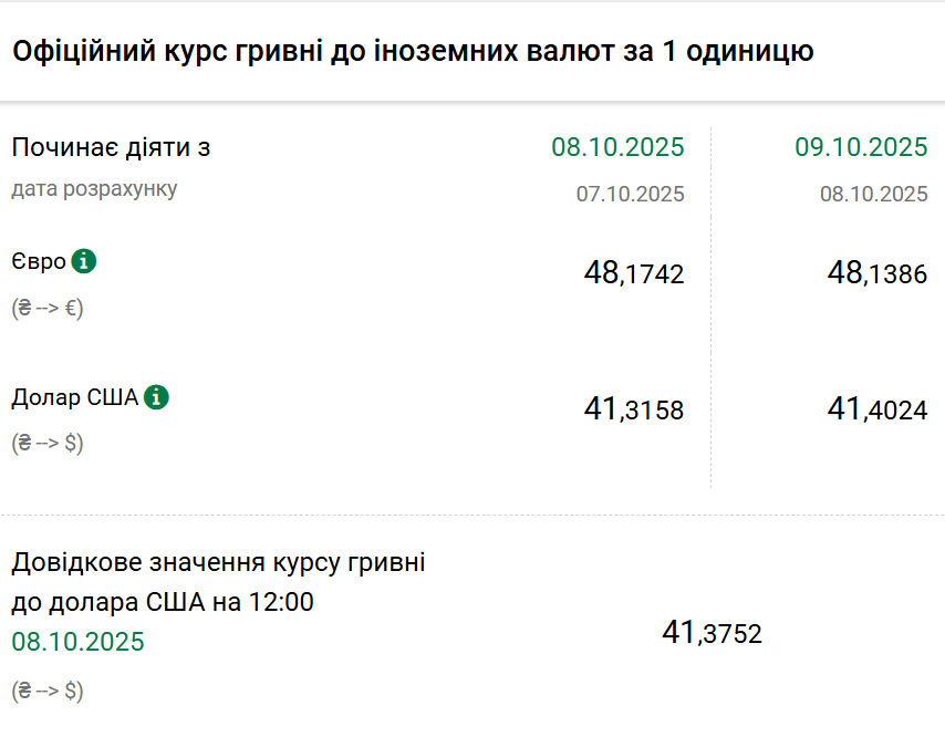 Так, на четвер, 9 жовтня, Нацбанк встановив офіційний курс на рівні 41,40 гривні за один долар. Офіційний курс у середу становив 41,31 гривні за один долар. На готівковому ринку долар зріс на п'ять копійок — 41,55 гривні.