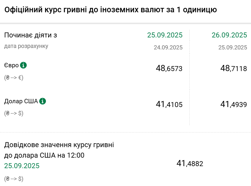 Станом на п'ятницю, 26 вересня, Нацбанк встановив офіційний курс на рівні 41,49 гривні за один долар. Офіційний курс у середу становив 41,41 гривні за один долар. На готівковому ринку долар зріс на 10 копійок — 41,65 гривні.
