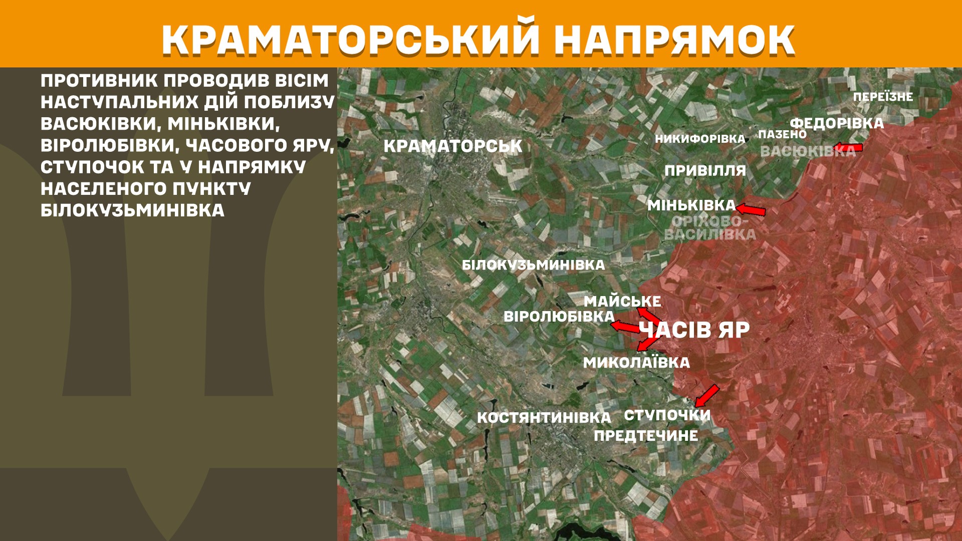 На Краматорському напрямку противник проводив вісім наступальних дій поблизу Васюківки, Міньківки, Віролюбівки, Часового Яру, Ступочок та у напрямку населеного пункту Білокузьминівка.