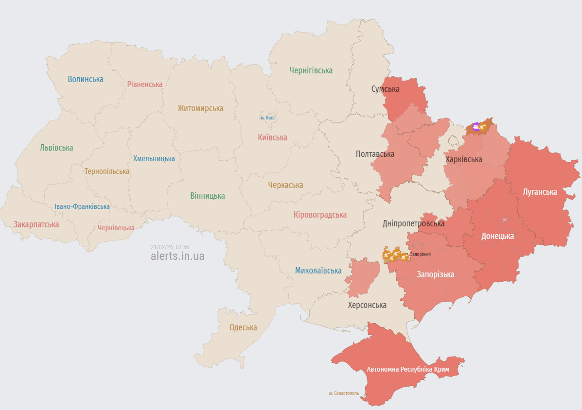 Зранку 21 лютого російські окупаційні війська запустили кілька груп ударних та розвідувальних безпілотників по території України. Під загрозою опинилися Сумська, Харківська, Одеська, Запоріжжя та Полтавська області, де зафіксовано рух ворожих дронів у різних напрямках.