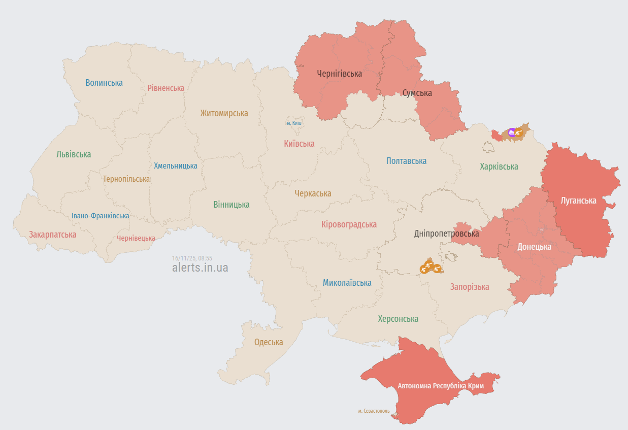У неділю зранку, 16 листопада, російська армія атакує Україну ударними безпілотниками. Загроза обстрілів існує для північних областей.