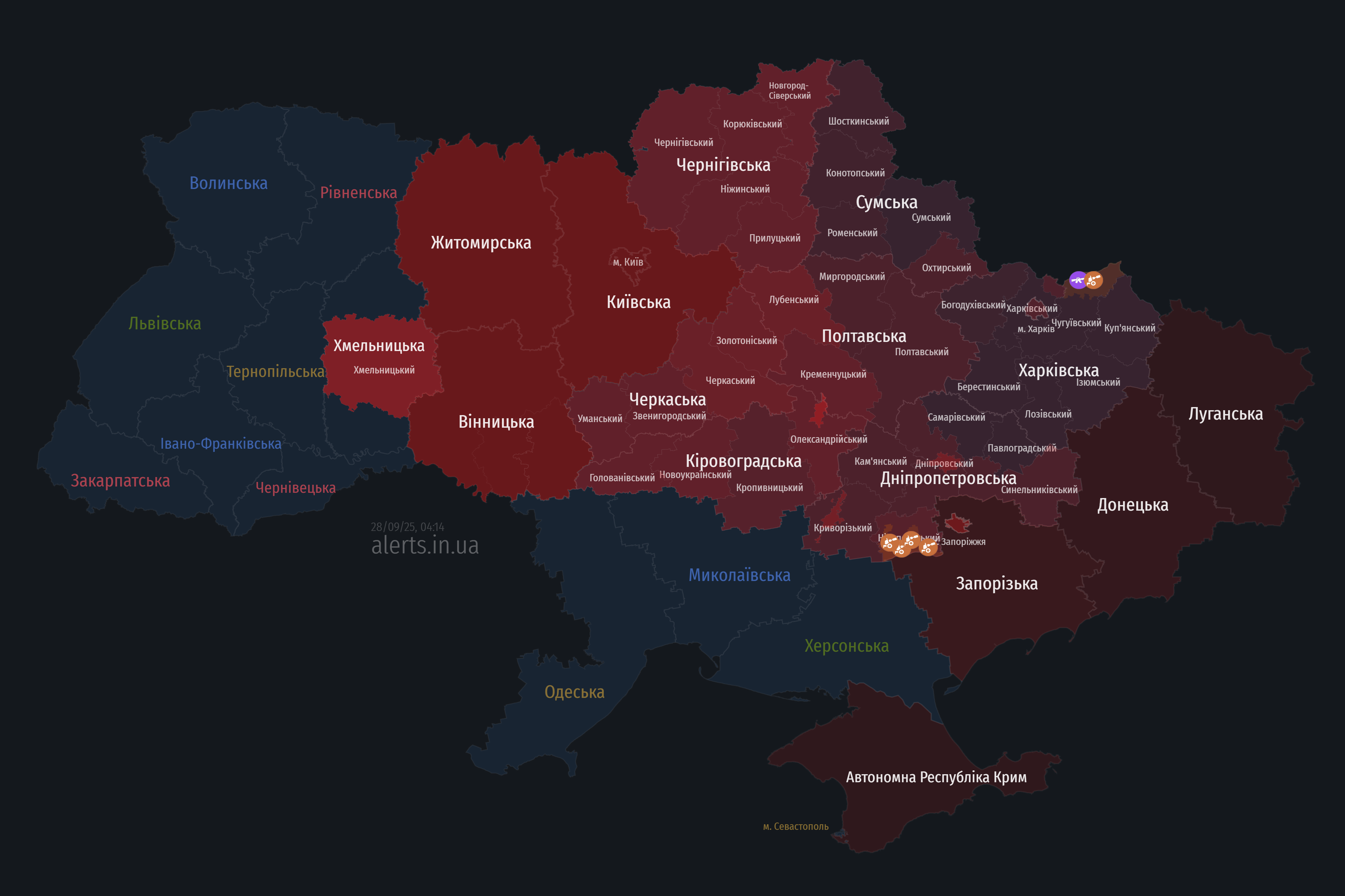У ніч на неділю, 28 вересня, у більшості регіонів оголошено повітряну тривогу. Росіяни здійснюють масований обстріл ударними дронами-камікадзе типу "Шахед". Також зафіксовано ймовірні пуски крилатих ракет стратегічними бомбардувальниками Ту-95МС в районі Енгельсу (Саратовська область РФ).