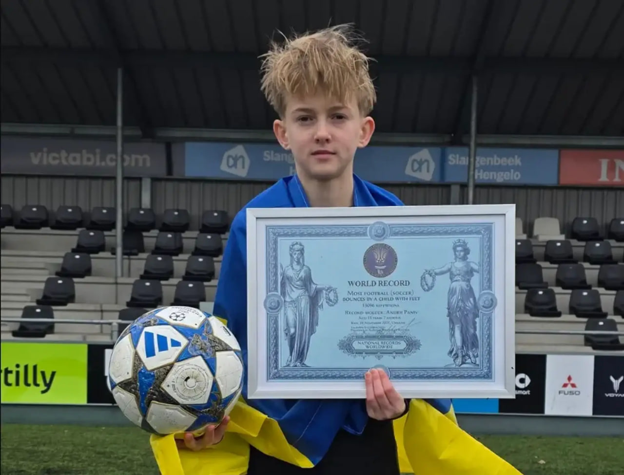 Українець Андрій Панів встановив світовий рекорд з жонглювання футбольним м’ячем серед дітей. 11-річний хлопчик за понад півтори години зробив 13096 дотиків до м'яча.Про це на своїй сторінці у фейсбуці повідомила очільниця Національного реєстру рекордів України Лана Вєтрова.Національний реєстр рекордів України визнав 11-річного мешканця села Сторона Львівської області світовим рекордсменом із набивань футбольного м’яча ногами серед дітей. Хлопчик жонглював м’ячем протягом години та 37 хвилин, здійснивши 13 096 дотиків до нього."Юний футболіст тренується щодня з восьми років, і тепер м’яч, наче на невидимих нитках, слухняно реагує на рухи свого маленького господаря. У хлопчика недитяча залізна витримка: тримати м’яч у повітрі десятки тисяч разів поспіль — це виклик не лише для м’язів ніг, а й для концентрації уваги. Будь-яка секундна слабкість — і рекорд би провалився", — зазначила Вєтрова.Вона додала, що на запрошення засновника Федерації вуличного футболу України Іллі Варченка рекордсмен України та світу Андрій Панов отримав можливість тренуватися у Нідерландах, у ФК АТС 65 (місто Хенгело), де вже за 14 ігор забив 33 голи.Нагадаємо, раніше уродженець Закарпаття 12-річний Василь Маєвський встановив національний і світовий рекорд. Хлопець зробив 16 поштовхів гирі вагою 32 кілограми. .