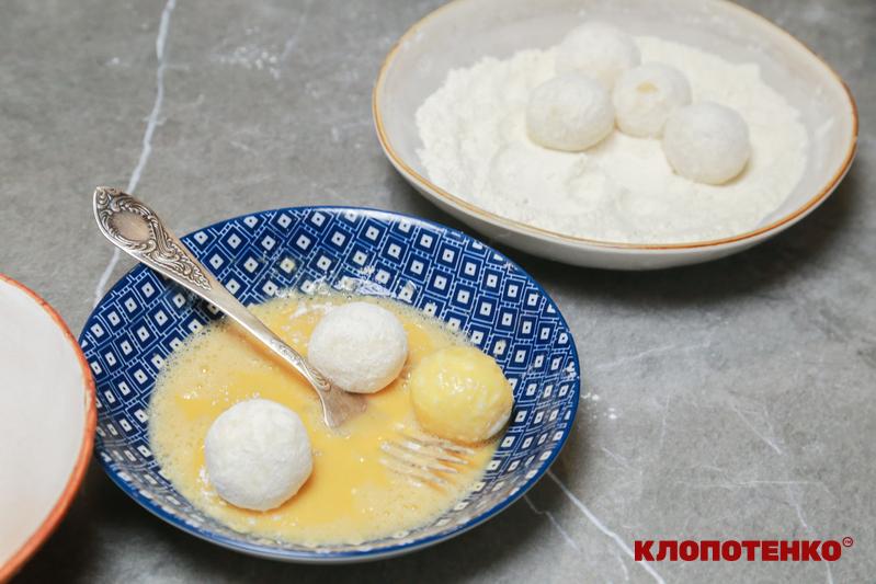 - Запанірувати картопляні кульки у борошні, яйці та сухарях. Потім знову у яйці та сухарях.